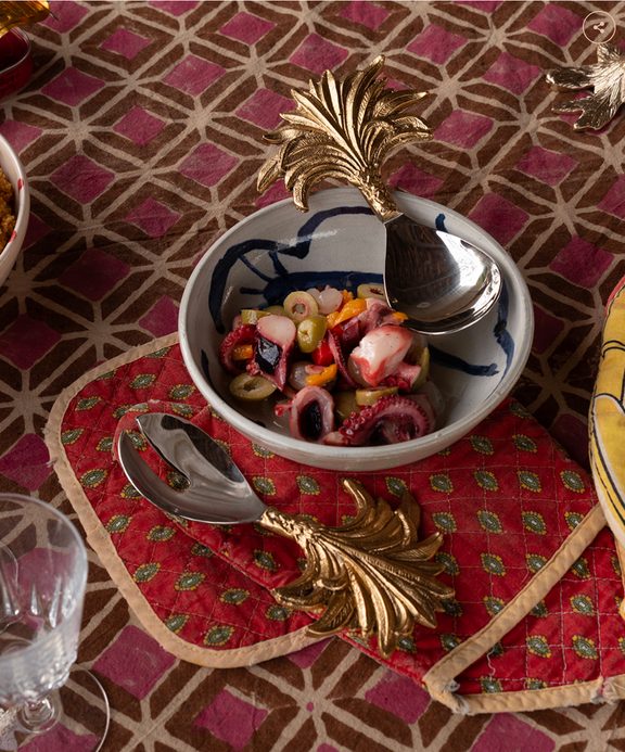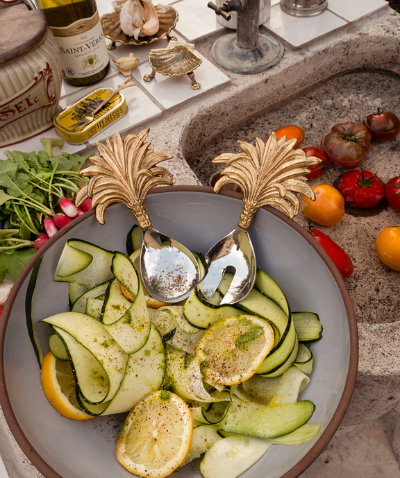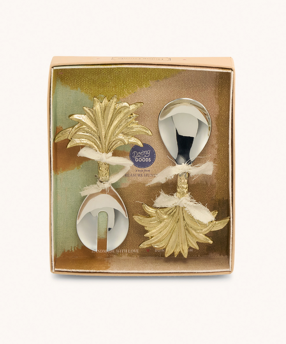 Vervaardigd uit gerecycleerd messing en roestvrij staal, en met de hand gemaakt door vakmensen in India, brengt deze set een vleugje duurzame luxe in je interieur. De handvatten met subtiel palmontwerp zorgen voor een tropische toets die elke maaltijd doet aanvoelen als een kleine ontsnapping.