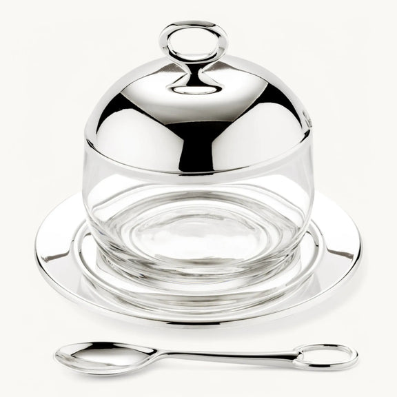 Stijlvolle confituurpot van kristalglas met edel verzilverde afwerking, inclusief bijpassende onderzetter en lepel. Bewaart aroma en smaak optimaal en staat elegant op elke tafel.