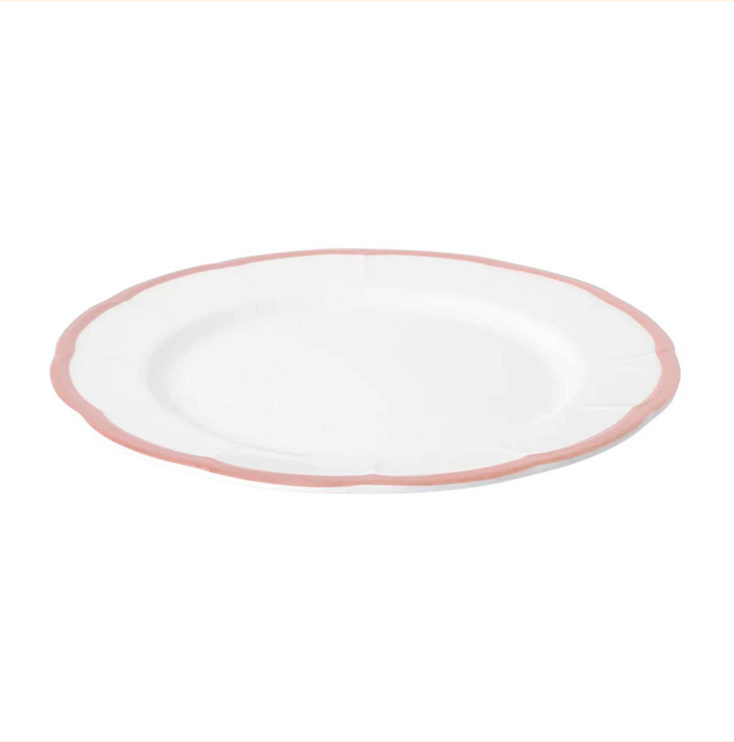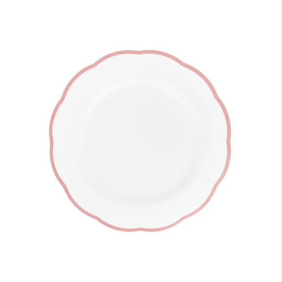 Breng elegantie naar je tafel met het ontbijtbord Petalo in zachtroze. Dit porseleinen bord met golvende rand combineert een tijdloos wit oppervlak met een verfijnde roze omlijsting, perfect voor ontbijt, lichte lunches of dessert.