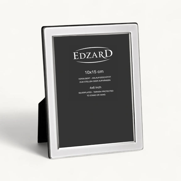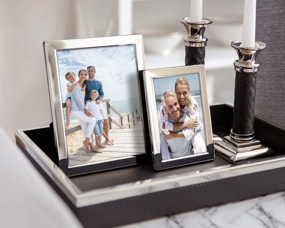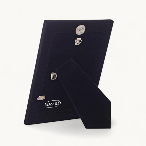 Elegante fotolijst met edel verzilverde afwerking en aanslagbescherming. Voorzien van een luxe zwarte fluwelen achterzijde en geschikt voor zowel staand als liggend gebruik. Kan neergezet of opgehangen worden.
