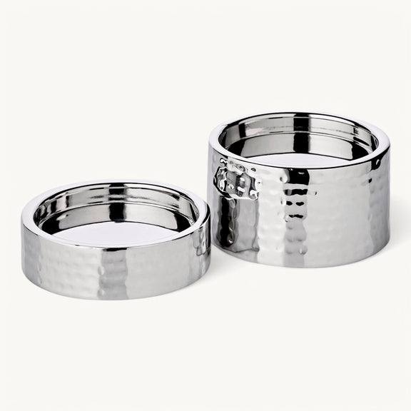 Moderne set kaarsenhouders van hoogglans gepolijst roestvrij staal met een elegante gehamerde afwerking. Geschikt voor standaard stompkaarsen en voorzien van een fluwelen voet voor een krasvrije, stabiele plaatsing. Perfect voor een sfeervol en stijlvol interieur.