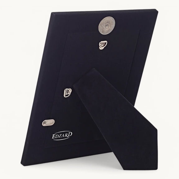 Tijdloze fotolijst met edel verzilverde afwerking en aanslagbescherming. Voorzien van een luxe zwarte fluwelen achterzijde. Geschikt om neer te zetten of op te hangen, zowel staand als liggend.