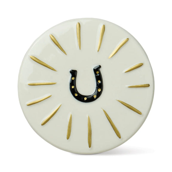 Stoere geurkaars in zwart glas met een keramisch hoefijzer-deksel, handbeschilderd en afgewerkt met gouden details. Gevuld met de warme, houtachtige geur Tabac & Pine. Na gebruik kan het potje hergebruikt worden als decoratief item – zo blijft het geluk voortleven.