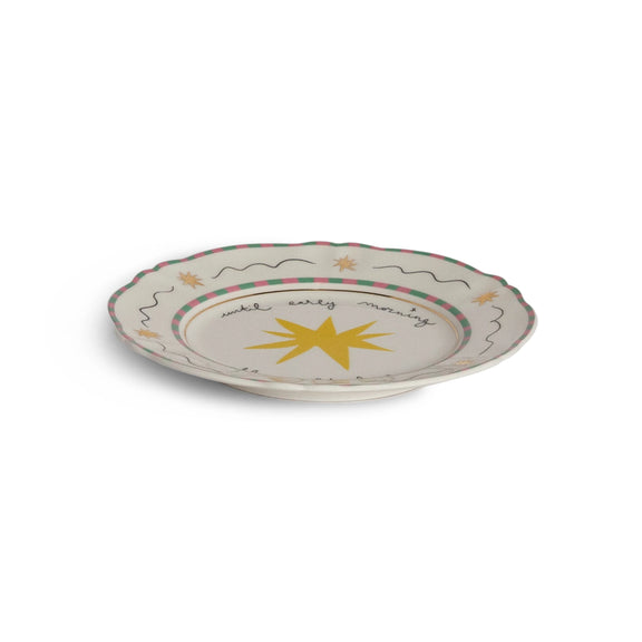 Breng een vleugje magie naar je tafel met dit unieke porseleinen bordje uit Italië. In het midden staat een ster, omringd door de handgeschreven tekst “all night long ... until early morning ” en subtiele gouden accenten. De golvende rand, met zijn grafisch blauw-roze patroon, geeft het bord een speelse, bijna sprookjesachtige uitstraling.