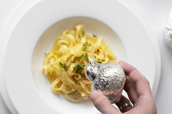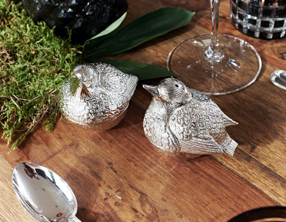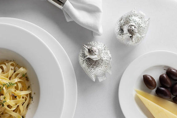 Charmant setje zout- en pepersetje met verfijnd musjesmotief. Edel verzilberd, hoogglans gepolijst en aanslagvrij. Praktisch in gebruik en een stijlvolle blikvanger op tafel. Ook geschikt als kruidenstrooier.